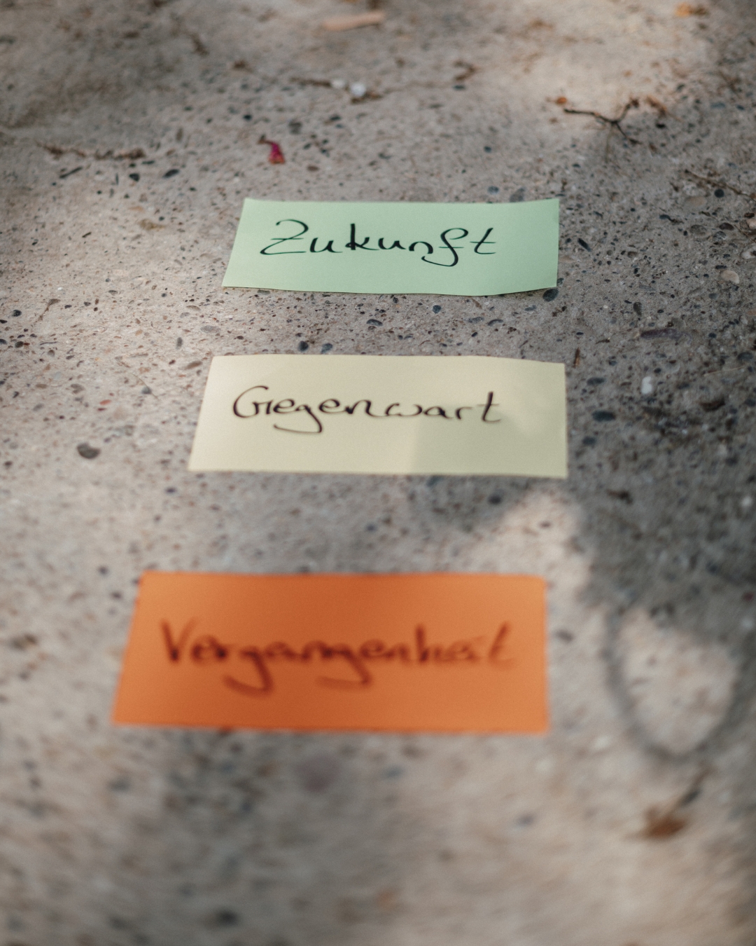 Drei bunte Notizzettel mit den handschriftlichen Worten „Vergangenheit“, „Gegenwart“ und „Zukunft“ liegen nacheinander auf steinigem Boden.